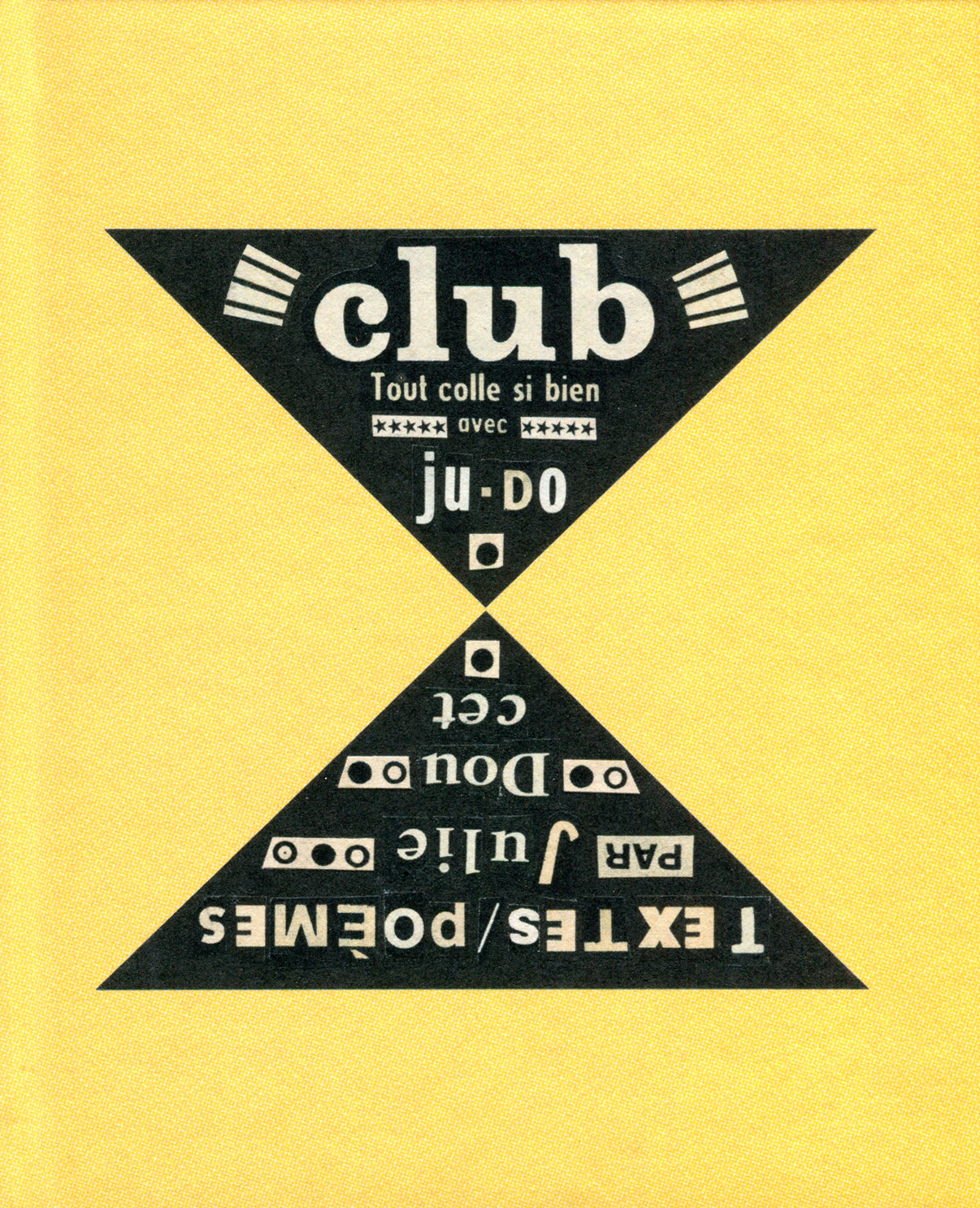Poèmes écrits à l’aide de mots découpés dans de vieux magazines ou journaux. Cadre physique imposé d’une forme géométrique : le triangle. Mode, masculinité, obsession de la beauté et de la propreté…